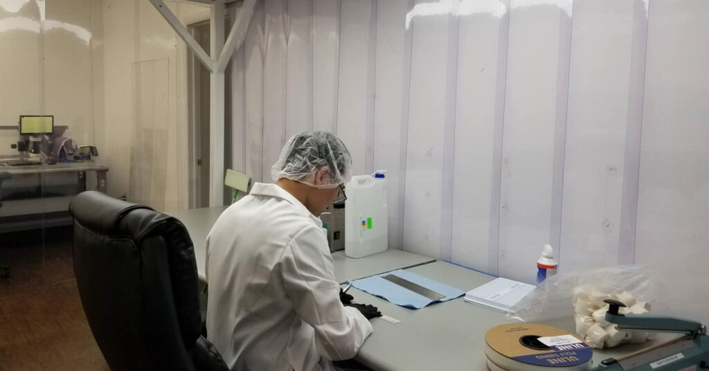Located in the Quality Control (QC) area of our facility, the 12-1/2’w x 6’d x 7’h cleanroom sits adjacent to a large wash tank for wires and tubes, functioning as the final stage of cleaning and packaging.