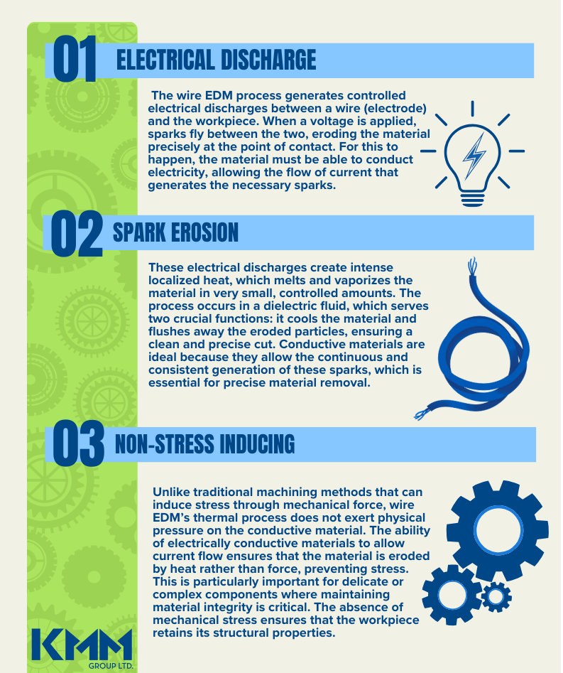 Wire EDM Only Works with Electrically Conductive Materials: Here’s Why Wire EDM relies on a fundamental principle: the processed material must be electrically conductive. This requirement stems from the nature of the process, which uses electrical discharges (sparks) to erode the material. Here’s the science behind why electrically conductive materials are essential to wire EDM processing: